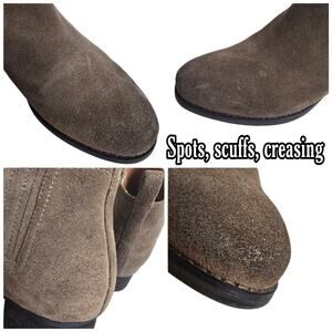 Brown sueded leather upper chelsea boots. Pull on style w/ stretch gores on sides, almond toe, chunky low heel, ankle height shafts. Issues noted in photos. Very good preowned condition, overall. Size 8 by Jeffrey Campbell. Style: Warr