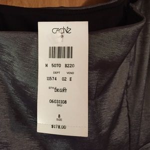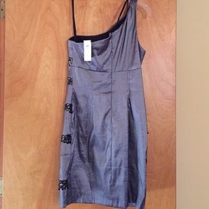 New with tags - cocktail type dress , 1 shoulder strap. Grey with black sequence, 59% polyester, 36% nylon, 5% spandex - has a little stretch to it. Beautiful dress for wedding, night out, night events, etc
