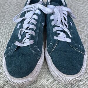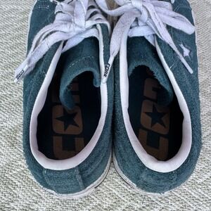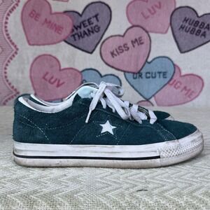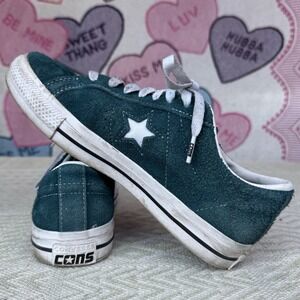 The product is a pair of Converse One Star Pro Low sneakers in Midnight Turquoise, designed for men in a size 8. These athletic shoes feature a low top shaft style and a star-themed design, making them a stylish choice for casual or athletic wear. The green color adds a pop of color to any outfit, while the Converse brand ensures quality and durability. Perfect for those looking for a comfortable and fashionable sneaker option.