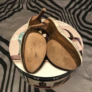 Striped Wooden Platform Heels in Fair condition. Wear on bottom of sole as pictured. Original box not included. Heel height: 6” Platform height: 2&1/8”