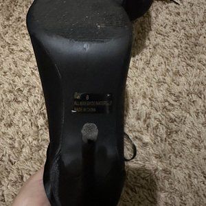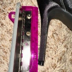 Open-toed, black silk/satin material with open laces. Three roses are on the laces, one big red and two small black ones. Size 8, but run large so a 10 will likely fit. 4in tall, only worn once with minimal dust/scuff on the bottom.