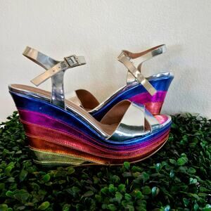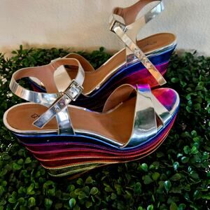 Size 8 – Qupid Metallic Silver & Rainbow Platform Wedge Sandals (NWOB)