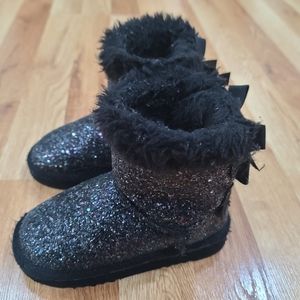 Pre-loved sparkling black toddler girls size 8 winter snow boots. Features bow details at the back with great padding for comfort and warmth. The boots are in good condition. No rips or tears.