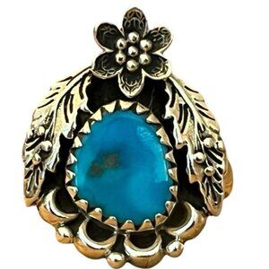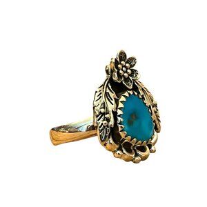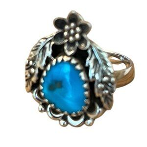 Size 8 Turquoise Sterling Silver Ring Flower and Leaf Design Southwestern Navajo