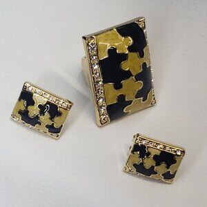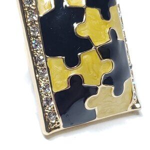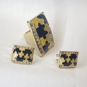 Yellow and Black Epoxy Puzzle Design Ring with Rows of Crystals & Earrings