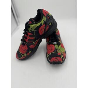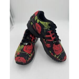 The product is a pair of adidas ZX Flux sneakers in a size 8, designed specifically for women. The color scheme features a black base with red roses accents, giving it a stylish and feminine look. These athletic shoes belong to the adidas ZX product line, known for their comfortable and trendy designs. Perfect for both casual wear and athletic activities, the adidas ZX Flux Red Roses W sneakers are a fashionable choice for women looking for a sporty yet chic footwear option.