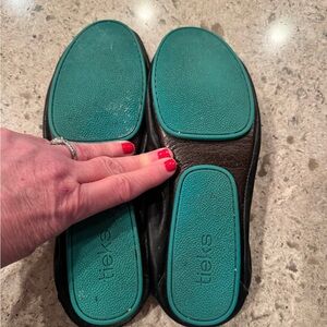 Black matte leather size 8 Tieks. Excellent toes and heels. Classic. Elegant. Wardrobe staple. Take 15% off your total with two purchases of Tieks from my closet.