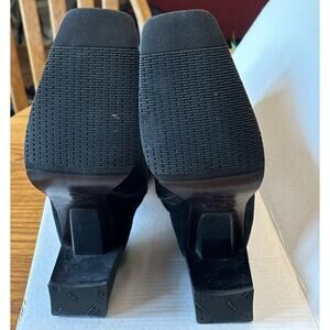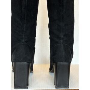 Elevate your style with these elegant and gorgeous knee-high boots from Carlos Falchi. Crafted from high-quality black leather and suede, these boots feature a zip closure and a block heel that provides both comfort and style. The shoe shaft style is knee-high, with a medium width and a high heel height of 3 inches and up.