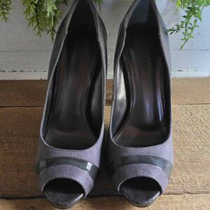 Gray peep toe Maurices heels size 8.5. There is a minor scuff at the back side of one shoe.
