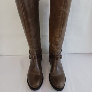 Gorgeous supple brown size 8.5 Matisse leather women's Britain Saddle knee high women's boots with belt/buckle accent around ankle, 16 inch shaft, and 1.5 inch heels.