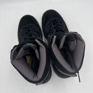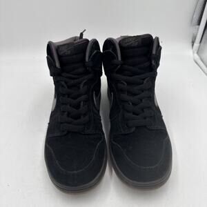 The product is a pair of Nike Dunk Pro SB High Top sneakers in size 8.5. These shoes, released in 2005, feature a high top design with a suede upper material in a sleek black color. Part of the Nike Dunk product line, these athletic shoes are perfect for active men who appreciate style and performance. The Nike Dunk Pro SB High Fog in size 8.5 offers a classic sneaker style with a durable construction, making it a versatile choice for everyday wear or sports activities.