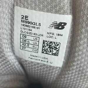 HARD TO FIND WIDTH! New Balance 990 V5 Made in USA Sneaker! Men's Size 9 2E = Men's Wide width. See designer's site for sizing help and additional pics. Previously worn, condition as shown. Comes with new gray laces by New Balance! Smoke-free, pet-free home. Authentic, final sale, no returns. Toy solider is not included. Tags M990GL5, 990, 990v6, 990v5, 990v4, 9 EE, 9 2E, 990 9 2E