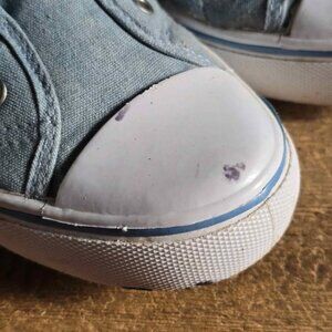 Maurices blue and white slip on sneakers size 9. There are some marks/scuffs to the toes and white rubber along with a tiny yellow spot at the side of one shoe where the canvas meets the rubber.