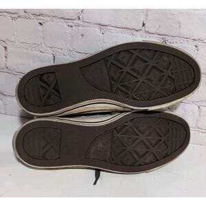 This is a pair of customized Converse high top sneakers. They are made to look exactly as you see them. That is not dirt or oil on them, that is a distressing factory made. I believe these shoes were made for .... well zombie wedding! They are a women's size 9. The upper is denim, light on the outside, darker on the inside. There is magnolia embroidery on the outside of each shoe, and "His Queen" embroidered on the back. These are the perfect goth zombie grunge sneakers!