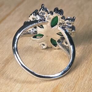 A sparkling statement ring shaped like a blooming flower, featuring emerald-green marquise-cut stones surrounded by clear zircon accents that catch the light with every move. The bright silver-tone finish and dimensional petals give it a lush, fairy-garden elegance — perfect for dressing up everyday looks or adding a little magic to evening wear.