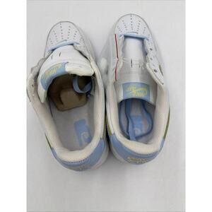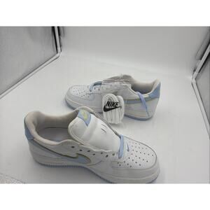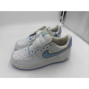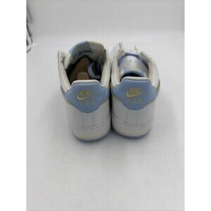 The product is a women's size 9 Nike Air Force 1 Low in the Ice Blue Maize colorway. This sneaker features a low top design with a leather upper, making it a stylish and comfortable option for athletic wear. With its iconic Nike Air Force 1 model and sleek white color, this shoe is a versatile addition to any wardrobe. Perfect for everyday wear or special occasions, these sneakers are a fashionable choice for women who appreciate both style and functionality.