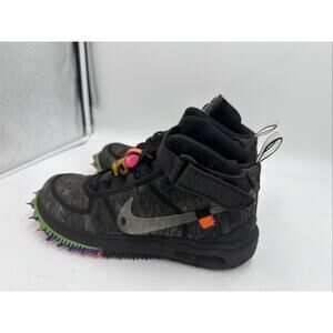The product is a pair of Nike Air Force 1 x Off-White sneakers in a black colorway, released in 2022 with a size 9. This mid-top sneaker features a classic Nike Air Force 1 silhouette with unique styling from Off-White, making it a sought-after addition to any sneaker collection. Designed specifically for men, these athletic shoes offer both style and comfort for everyday wear.