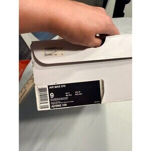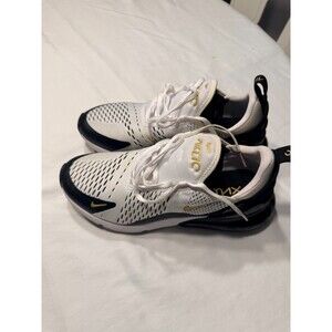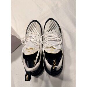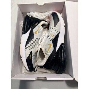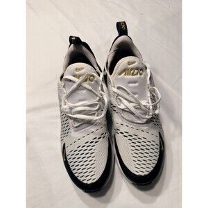 The product is a pair of Nike Air Max 270 sneakers in white, gold, and black colorway. These athletic shoes feature a low top shaft style, lace-up closure, and a rubber outsole for durability. With a size 9 US shoe size, they are designed for casual occasions and running/jogging activities. The foam insole provides cushioning and comfort, making them suitable for all-day wear during the summer, fall, and spring seasons. Signed by Nike and part of the Air Max product line, these sneakers are a stylish and functional addition to any man's wardrobe.