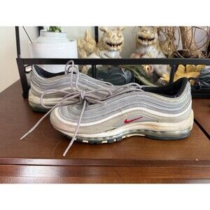 The product is a pre-owned pair of Nike Air Max 97 OG QS 2017 Silver Bullet sneakers in size 9. These iconic athletic shoes feature a sleek design with a gray colorway and the signature Max character. Part of the Nike Air Max product line, these sneakers offer both style and comfort for men looking to make a statement with their footwear.