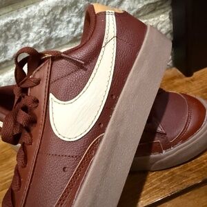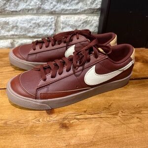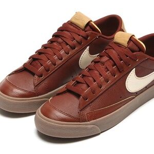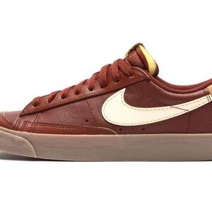 The product is a pair of Nike Blazer '77 EMB Low sneakers, size 9 for men (equivalent to a Women's 10.5). These athletic shoes feature a low top style with a brown colorway made of leather material. Released in 2022, these sneakers are part of the Nike Blazer product line and have been inspected by Swoosh. The style code is DQ7670-200, and they are a stylish and comfortable option for casual wear or athletic activities.