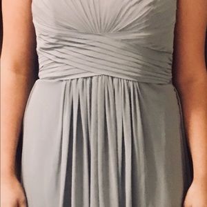 Grey, size 9/10 bridesmaid dress. Strapless, long touches the floor when my daughter wore 3 inch heels and she is 5ft 3.