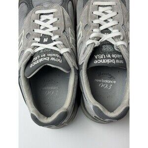These New Balance 993 Made in USA Grey Suede Running Shoes (Style MR993GL, Size 9.5 4E Wide) are in pre-owned, well-worn condition with visible signs of use throughout. Please carefully review all photos for exact details.