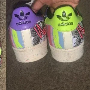 Brand is adidas, shoes are called adidas Kris Andrew Small x Superstar Pride, colors are crème, green highlighter, purple, pink and black size 9.5 super cool shoes only wore twice