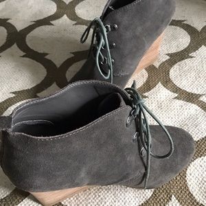 Gray suede tie up booties with wood-like stacked wedge heel. Size 9.5. Gently worn. Like New.