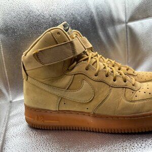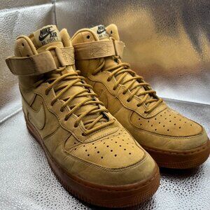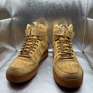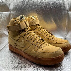 The product is a pair of Nike Air Force 1 '07 LV8 WB High Flax 2016 tan men's shoes in size 9.5. These sneakers feature a lace-up closure, rubber outsole, high-top shoe shaft style, and are designed for activewear or casual occasions. With arch support, cushioning, comfort, and breathability features, these shoes are suitable for all seasons and have a solid brown color with a flax upper material. Manufactured in Vietnam as part of the Nike Air Force product line, these shoes are great for outdoor activities and basketball performance.