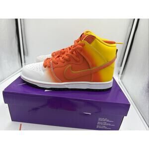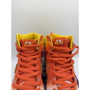 The product is a pair of Nike SB Dunk High Sweet Tooth sneakers in a size 9.5 US, UK size 8.5, and EU size 43. The high top shoe features a vibrant orange color with a Halloween theme, perfect for various seasons including winter, summer, fall, and spring. Designed for athletic activities such as walking, skateboarding, and basketball, these sneakers are part of the Nike SB product line. With a stylish and trendy sneaker design, these Nike SB Dunk High Sweet Tooth shoes are a must-have for any sneaker enthusiast.
