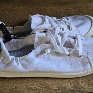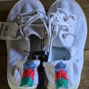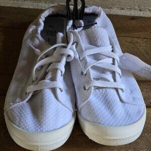 New with tags white slip-on scrunch back memory foam sneakers size 9.5. There are some minor marks to the rubber trim and some small faint yellow spots on the canvas of shoes along with a tiny dark spot at the heel of one that happened in storage. Please see close ups.