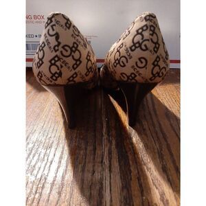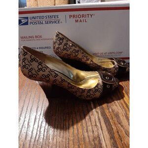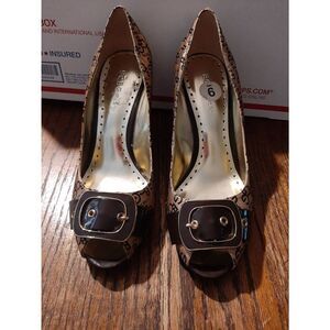 Good Used Condition (Some Denting on the Heels, Inside Starting to Peel, Minor Tarnish on Hardware-Please See Pictures) Women's Size 9B BCB Girls Wedge Logo Buckle Open Toe Brown And Tan High Heel Shoes