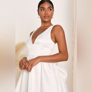 Key words: lulus dress, lulu's dress, dress with bow, lulus sexy dress, cocktail party, wedding guest, bridesmaid, wedding, rehearsal dinner, prom, gala, school dance, formal, satin, luxury, dress, dresses, bridesmaid dress, wedding dress, rehearsal dress, Lulus Dress Blissfully Beloved Ivory Backless A-Line Bow Maxi Dress