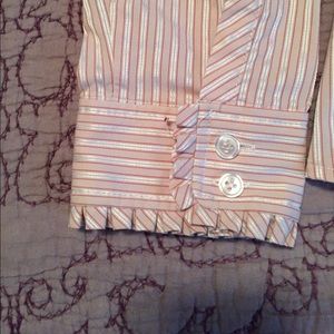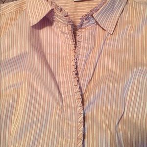 Size L New York & Company button down shirt. Beautiful dress shirt with lovely ruffles along the cuffs collar & buttons.