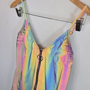 Features: Reflective fabric, bodycon silhouette, large front zipper with circle pull, rave-ready