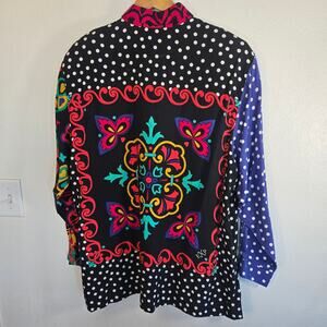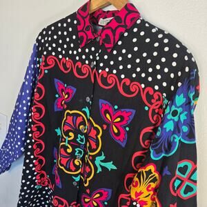 Flowy button-down shirt with paisley, polka dots, and vibrant print blocking in primary colors on black/white base. Lightweight rayon with side slits and subtle shoulder padding. Signature E-X-P logo on back.