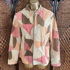 Pink and brown colorblock suede jacket. No pockets. Front zipper. Lined. Fun and unique piece.