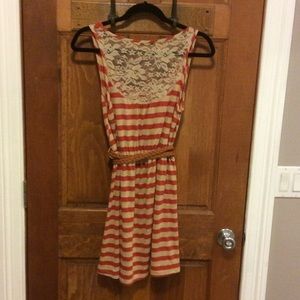 Size large dress with belt included. Lace details on the back, buttons on the front. Super cute orange stripes! Adorable with brown boots!