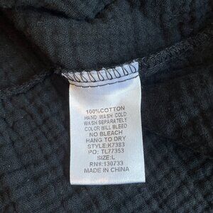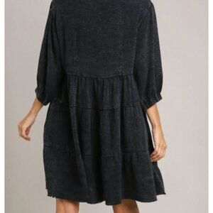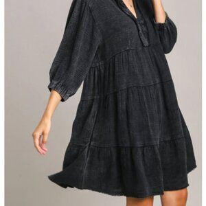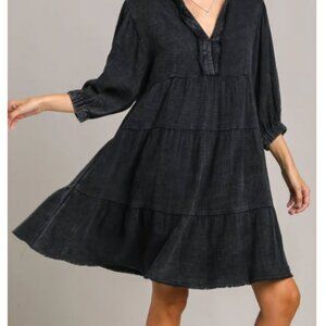 New with tags. Size Large Umgee snow washed cotton gauze dress in Ash (black). Crafted from lightweight 100% cotton gauze, this dress features a collared V-neck, quarter length sleeves with elastic band cuffs and tiered skirt. The unfinished frayed hemline adds the perfect finishing detail to this dress! This dress would pair great with sandals or cowboy boots! So versatile and super soft and comfortable!