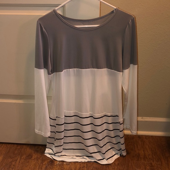 Grey/white/ striped top. NWT, never worn. Material feels silky