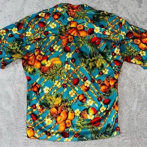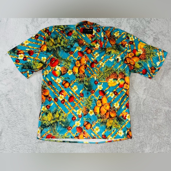 Vibrant tropical fruit print shirt. Features a colorful design with fruits and leaves.