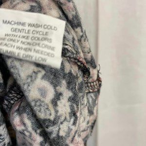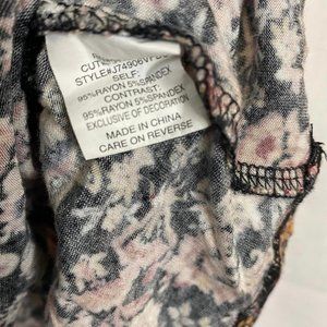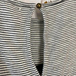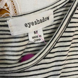 Size M Tee by Eyeshadow has stripes on top, a small peekaboo lace divider then a multicolor bottom and a small eyelet with button on back. Flowy, skirt-like bottom.
