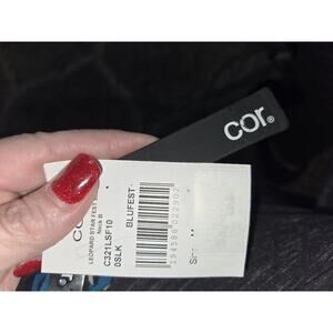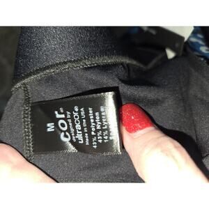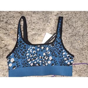 This Size M Ultracor sports bra features a stylish leopard print design in teal, white, and black colors. The bra has a scoop neckline, medium support level, and a pullover closure for easy wear. Made from a blend of polyester, nylon, and lycra, this machine washable sports bra is suitable for any performance or activity. The Ultracor brand ensures high-quality activewear, perfect for women looking for comfort and style during their workouts. Retail is $89