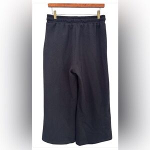Stylish black wide-leg pants with a drawstring elastic waist and front pockets. Ribbed square pattern throughout. Perfect for casual wear.