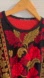 Vintage elegant women's sweater featuring a striking red and gold floral pattern.