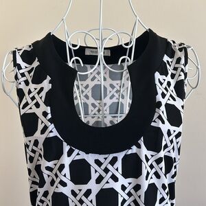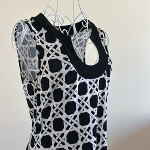 Why this tunic belongs in your wardrobe: This White House Black Market tunic features a bold black and white geometric print, making it a standout piece for both casual and semi-formal occasions. The 3/4 sleeves and relaxed fit offer comfort without compromising on style. Its versatile design allows it to be dressed up with accessories or kept casual for everyday wear.