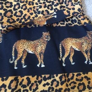 Animal print button down sleeveless top. Ties in back and is adjustable. Will fit Size M or a larger size small. Machine Wash/ tumble dry. Very light material. Great for summer. Comes from smoke free home. Asking price or best offer. Sorry colors are gold, black tan.