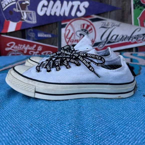 The product is a pair of Converse Chuck 70 Gore-Tex Sneakers designed for men in size 6.5. These low-top sneakers feature a multicolor design with a waterproof Gore-Tex construction, making them suitable for outdoor activities in various seasons. The shoes have a lace-up closure, rubber outsole, and fabric lining and insole, offering comfort and durability for walking and casual wear. The classic style and athletic functionality of the Converse Chuck 70 make them a versatile choice for both activewear and everyday casual outfits.