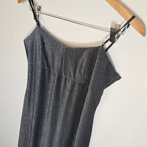 Shiny black with a silver sheen, this '90s slip dress is equal parts goth girl next door and dancefloor sparkle bomb. With adjustable straps, mini slits, and a classic empire cut, it gives Cardigans-music-video-core in all the right ways.