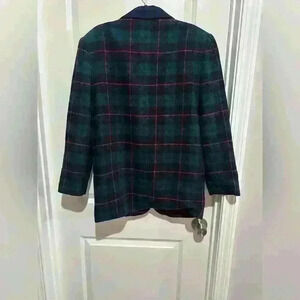 Vintage Maurice’s green plaid wool blazer jacket suede colar size Medium. Jacket body 40% wool 20% polyester 20% nylon 5% other. Green red teal navy blue plaid design with a navy blue suede colar. Silky lining. Vintage preowned no flaws. Good for Business office, blazer jacket coat winter Christmas pictures gender neutral trendy layers warm flannel plaid cozy classic traditional suit separates